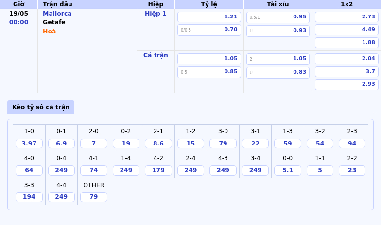 Tổng hợp kèo bóng đá Mallorca vs Getafe 00:00 ngày 19/05